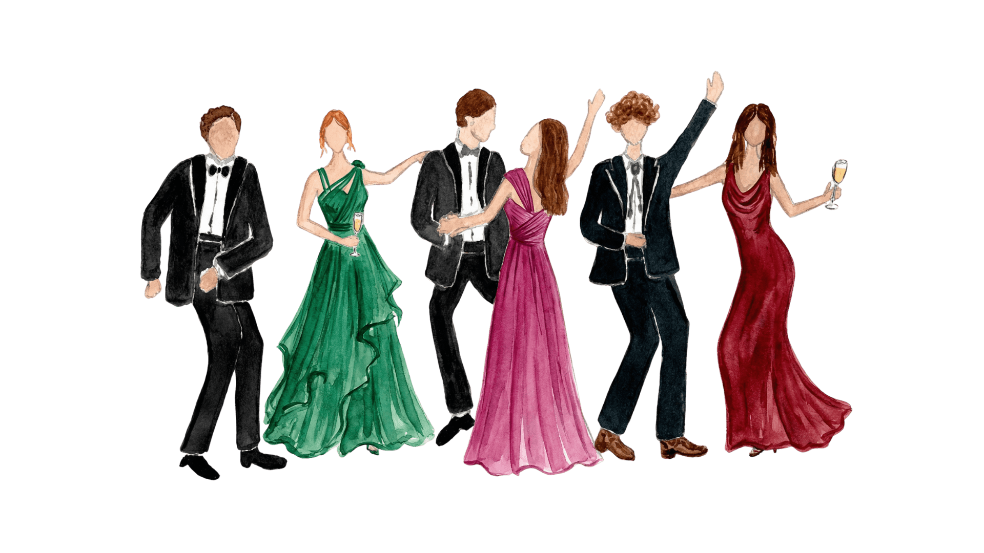 Gentlemen: Suit and tie · Ladies: Elegant dresses or gowns (long, midi or cocktail length)